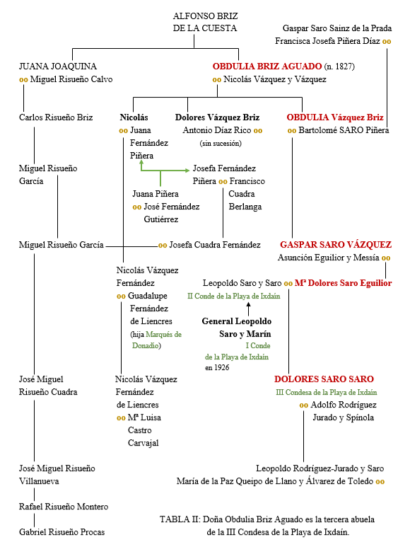 Resumen: Doña Obdulia Briz Aguado representa a las damas del siglo XIX, hijas de ricohombres y grandes burgueses cuyo linaje se forjó al amparo del negocio de la carretería y asentados en la villa de Almodóvar del Pinar (Cuenca). Dada la situación económica de esta familia muchos de los hijos varones tuvieron acceso a los estudios de la abogacía y judicatura, circunstancia que les permitió ejercer estos oficios en San Clemente así como el acceso a la compra de tierras de los extintos jesuitas tras la desamortización llevada a cabo por Carlos III e impulsada por el Conde de Aranda, en 1767, con el fin de crear una nueva estructura de propiedad. Tras el matrimonio de Doña Obdulia con el Juez de Primera Instancia D. Nicolás Vázquez, ejerciente en San Clemente y por cuestiones de destino de su esposo terminó afincada en la ciudad de Úbeda (Jaén). Sus hijos contrajeron matrimonio con miembros de los viejos linajes ubetenses como los Saro, Díaz, Marín, Piñera, Eguilior y Messía así como de las Casas de los Marqueses de Busianos, Marqueses de Cadimo, Vizcondes de Castillo de Almansa y finalmente, su tercera nieta Doña Dolores Saro y Saro se convertía en III Condesa de la Playa de Ixdaín, cuyo abuelo Don Leopoldo Saro y Marín fue uno de los más prestigiosos generales del ejército de Alfonso XIII.