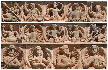 "Medallones tallados sobre tondos, en el friso superior de la fachada del Ayuntamiento de San Clemente".