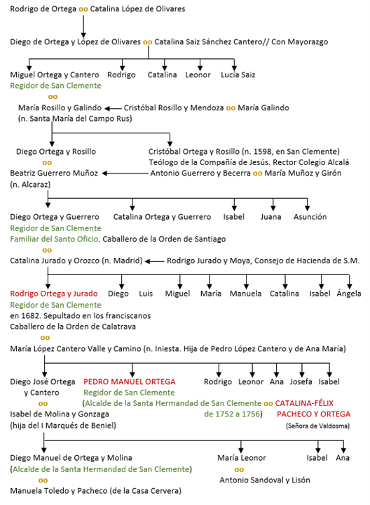 Se recuerda que el XL Comendador de Socuéllamos de 1604 a 1608 era Juan de Zúñiga Avellaneda y Bazán, y que su hijo, Diego López de Zúñiga Avellaneda y Bazán Pacheco y Cabrera era el XLI Comendador de Socuéllamos de 1608 a 1626 y que casó con Francisca de Sandoval y Rojas y de la Cerda, hija del I Duque de Lerma. Y los vecinos más destacados en San Clemente eran: en 1603, MARTÍN ALFONSO DE BUEDO, Tesorero de Alcabalas y Rentas Reales; Andrés Pacheco, visitador eclesiástico; FRANCISCO PACHECO DE GUZMÁN, Regidor, esposo de Ana Pacheco y Figueroa; en 1604, Alonso de Quiñones; en 1605, Diego de Tébar, Cristóbal de Tébar, María de Tébar; MARTÍN DE BUEDO GOMENDIO, Tesorero de Rentas Reales; en 1609, Francisco de Astudillo (padre), Tesorero de Rentas Reales; Rodrigo ORTEGA; en 1614, Rodrigo Pacheco, Señor de Minaya, esposo de María de Mendoza; JUAN PACHECO DE GUZMÁN, Alférez Mayor de San Clemente, y su esposa Elvira de Cimbrón e Inestrosa; Cristóbal Garrido, franciscano; en 1615, PEDRO GONZÁLEZ GALINDO, Tesorero de Rentas Reales; en 1616, Antonio de Tébar, cura párroco, sobrino del doctor Cristóbal de Tébar; en 1617, Padre de Francisco de Astudillo, Alcalde ordinario; en 1619, FRANCISCO ORTEGA, con casa principal; nace Lope de Vera y Alarcón (f. 1644); en 1620, doctor Sebastián Martínez de TRIBALDOS, hijo del Regidor García de Haro y de María Haro de Tribaldos; y en 1621, Luis de Maraver y Alvarado era el Corregidor [...]